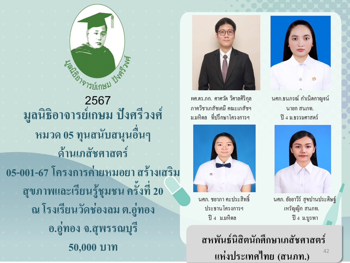 5.1 โครงการ “ค่ายหมอยาสร้างเสริมสุขภาพและเรียนรู้ชุมชน ครั้งที่ 20 ณ จังหวัดสุพรรณบุรี มอบให้นางสาวชยาภา คะประสิทธิ์ ประธานโครงการ สหพันธ์นิสิตนักศึกษาเภสัชศาสตร์แห่งประเทศไทย เป็นเงิน 50,000 บาท