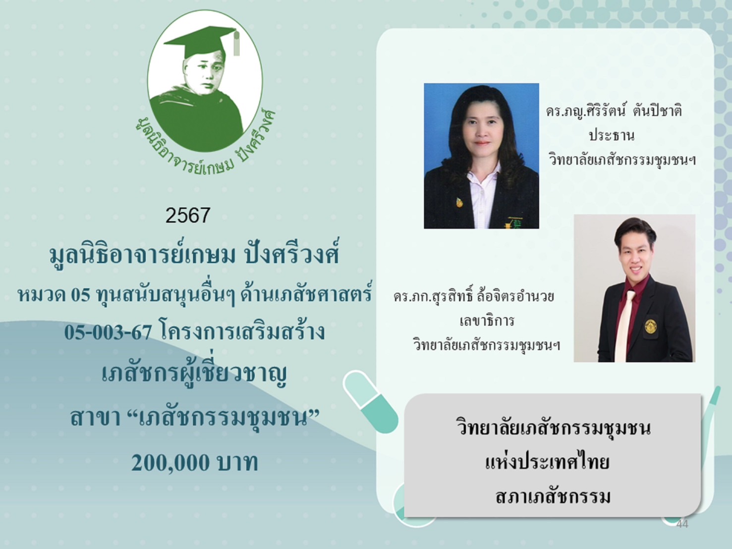 5.3 โครงการเสริมสร้างเภสัชกรผู้เชี่ยวชาญสาขา “เภสัชกรรมชุมชน” มอบให้ ผศ.ดร.ภก.สุรสิทธิ์ ล้อจิตรอำนวย เลขาธิการวิทยาลัยเภสัชกรรมชุมชนแห่งประเทศไทย เป็นเงิน 200,000 บาท