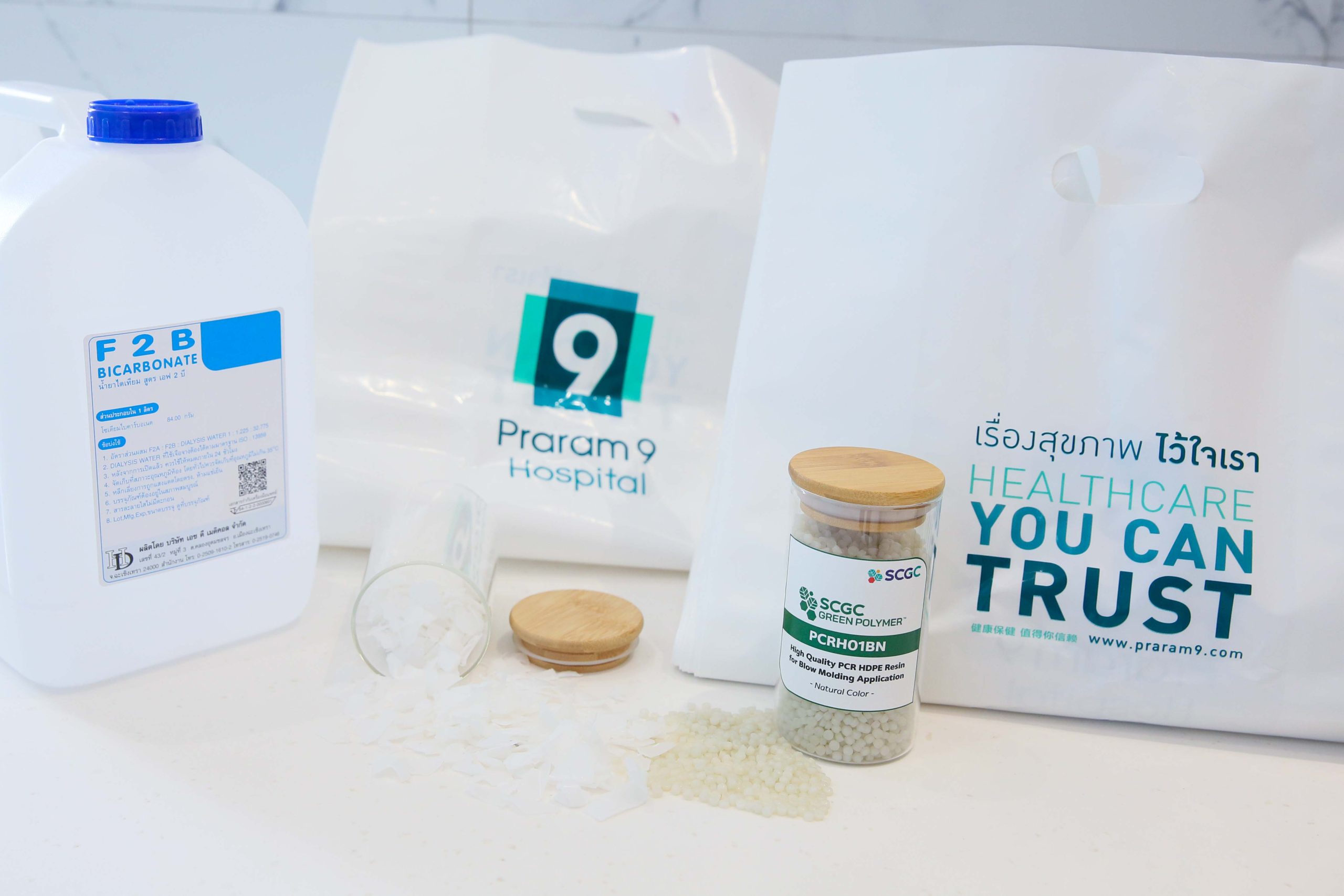 ซึ่ง SCGC มีความเชี่ยวชาญและได้คิดค้นพัฒนานวัตกรรมรีไซเคิลขั้นสูงมาอย่างต่อเนื่องจนเป็นที่ยอมรับจากแบรนด์ต่าง ๆ สามารถผลิตเม็ดพลาสติกรีไซเคิลคุณภาพสูง ภายใต้แบรนด์ SCGC Green PolymerTM เพื่อป้อนตลาดรักษ์โลก เช่น บรรจุภัณฑ์สำหรับผลิตภัณฑ์ดูแลเส้นผมและบำรุงผิว แกลลอนน้ำยาล้างจาน ขวดน้ำมันหล่อลื่น และ ถังสีทาอาคาร เป็นต้น สำหรับความร่วมมือกับโรงพยาบาลพระรามเก้าในครั้งนี้ เป็นการนำแกลลอนน้ำยาล้างไตใช้แล้วกลับเข้าสู่กระบวนการรีไซเคิลระบบปิดอย่างครบวงจร เปลี่ยนเป็นเม็ดพลาสติกรีไซเคิลคุณภาพสูงพอลิเอทิลีนความหนาแน่นสูง (High Quality PCR HDPE Resin)