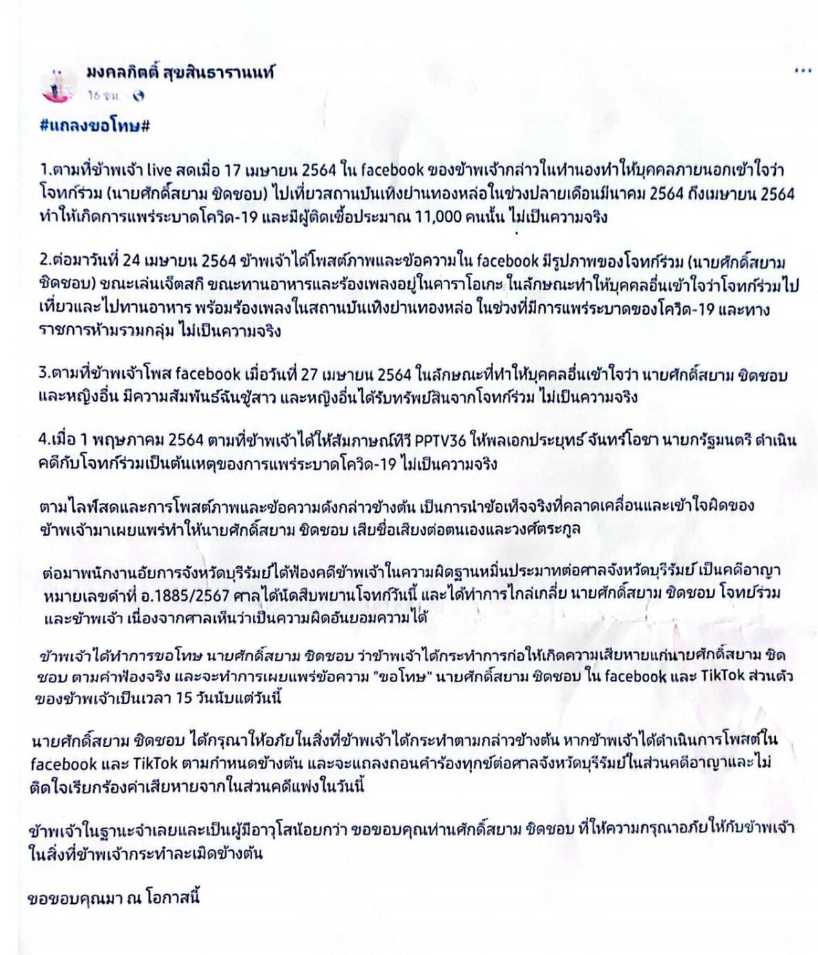 ข้าพเจ้าได้ทำการขอโทษ นายศักดิ์สยาม ชิดชอบ ว่าข้าพเจ้าได้กระทำการก่อให้เกิดความเสียหายแก่นายศักดิ์สยาม ชิดชอบ ตามคำฟ้องจริง และจะทำการเผยแพร่ข้อความ “ขอโทษ” นายศักดิ์สยาม ชิดชอบ ใน facebook และ TikTok ส่วนตัว ของข้าพเจ้าเป็นเวลา 15 วันนับแต่วันนี้