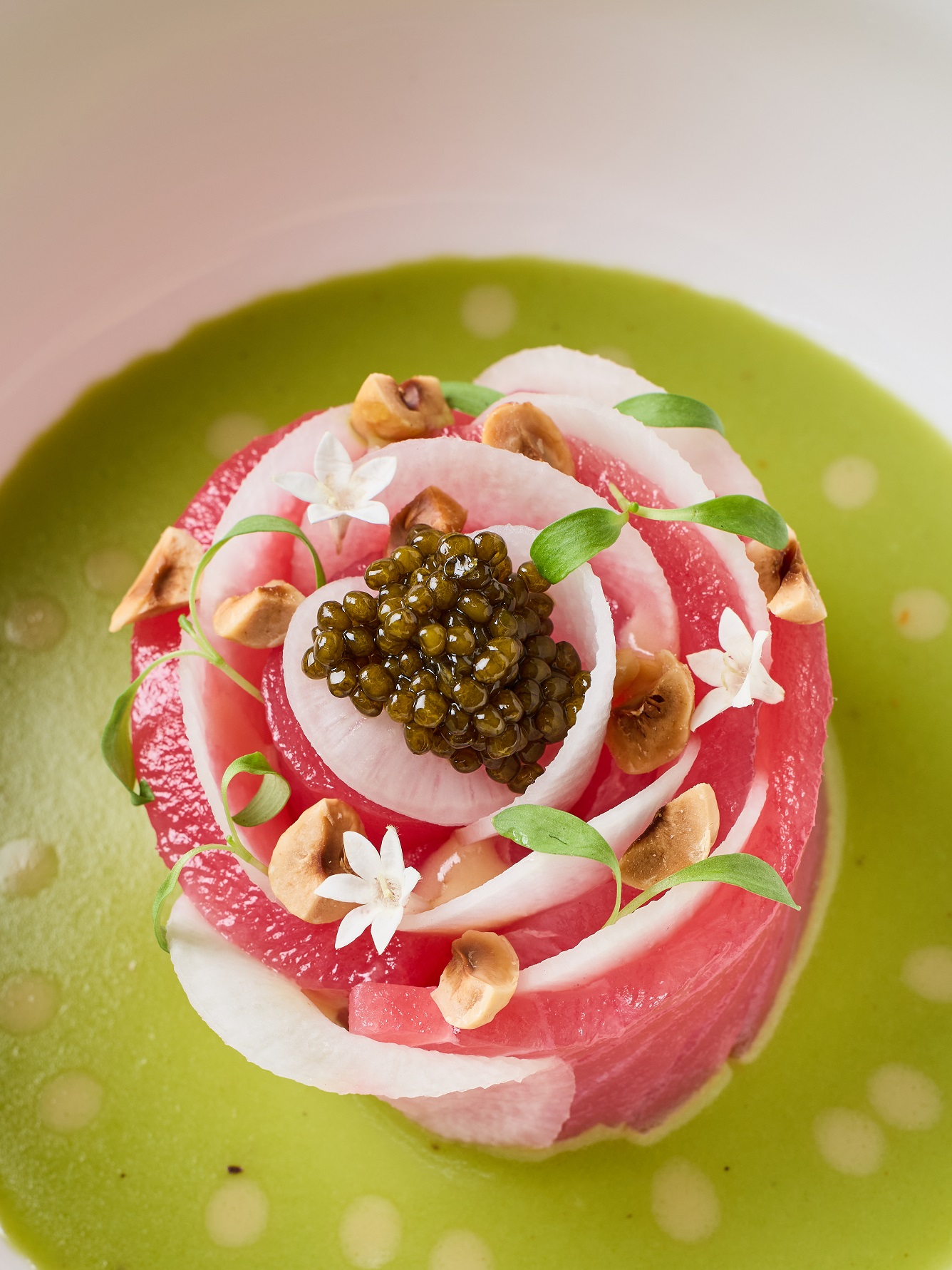 เริ่มต้นมื้อพิเศษด้วยเมนูเรียกน้ำย่อย เนื้อปลาทูน่าครีบเหลืองจากท้องทะเลเมดิเตอร์เรเนียน รังสรรค์ในรูปดอกกุหลาบเสิร์ฟคู่กับหัวไชเท้าสไลซ์บาง ครีมฮาลาเปญโญ ซอสเฮเซลนัท และคาร์เวียร์ (Yellowtail Tuna Crudo) ต่อด้วยซุปครีมข้นบริททานีล็อบสเตอร์สไตล์ฝรั่งเศส เสิร์ฟพร้อมเฟนเนลตุ๋นและมะเขือเทศกรอบ (Brittany Lobster Bisque) อิ่มอร่อยกับเมนูจานหลัก อกเป็ดปรุงรสสไตล์ฝรั่งเศสเสิร์ฟคู่กับทอร์เทลลินีไส้ขาเป็ดตุ๋น เกาลัด และเชอร์รี่เจล (Aged Muscovy Duck Breast) ปิดท้ายความอร่อยด้วยเมนูของหวานสุดโรแมนติก ราสพ์เบอร์รี่ทาร์ตเสิร์ฟคู่กับชอร์เบทราสพ์เบอร์รี่ (Raspberry Tart)
