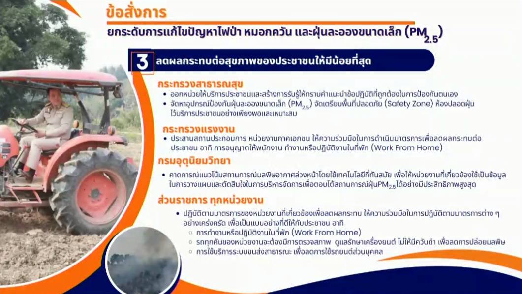 “มีคำถามว่าถ้าไม่เผาจะทำอย่างไร คำตอบคือรัฐบาลจะช่วย เรื่องการฝังกลบ จะหางบมาช่วยเกษตรกร ไปจนถึงการแปรสภาพซากวัชพืชทางการเกษตร ให้เป็นปุ๋ยเป็นเชื้อเพลิง เข้าใจว่าการฝังกลบต้องใช้เครื่องมือ ตรงนี้รัฐบาลจะเข้าไปช่วยเหลือ ตนจะนำเรื่องนี้ไปหารือกับท่านนายกฯ”