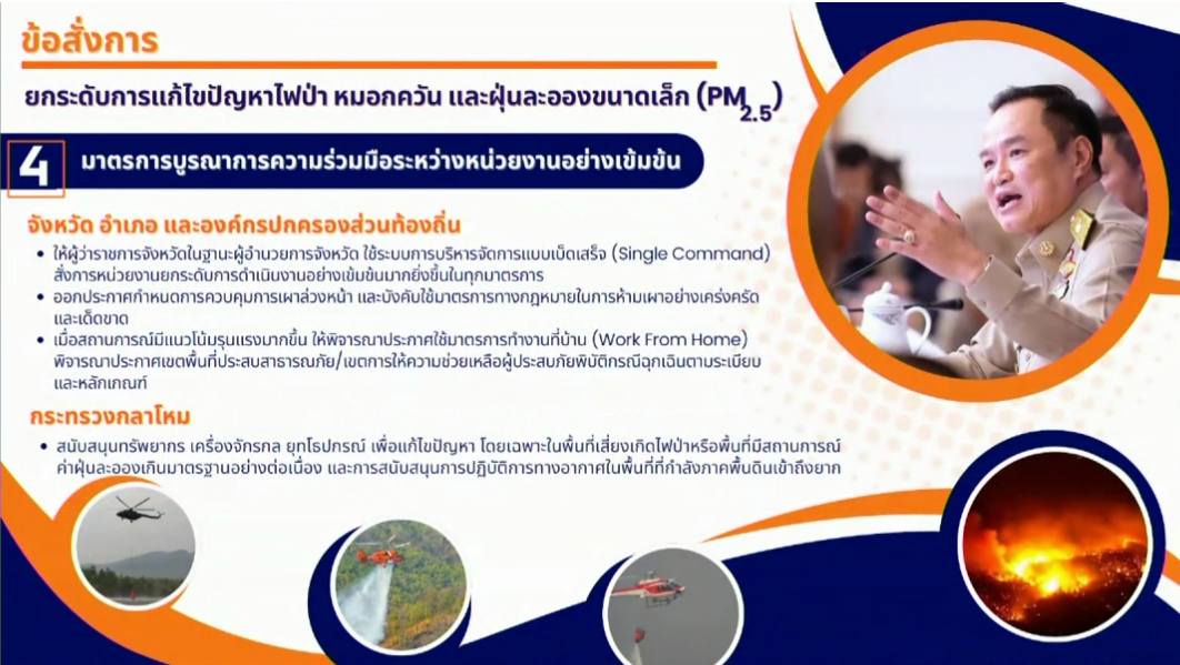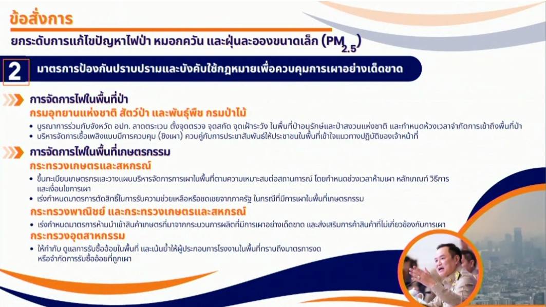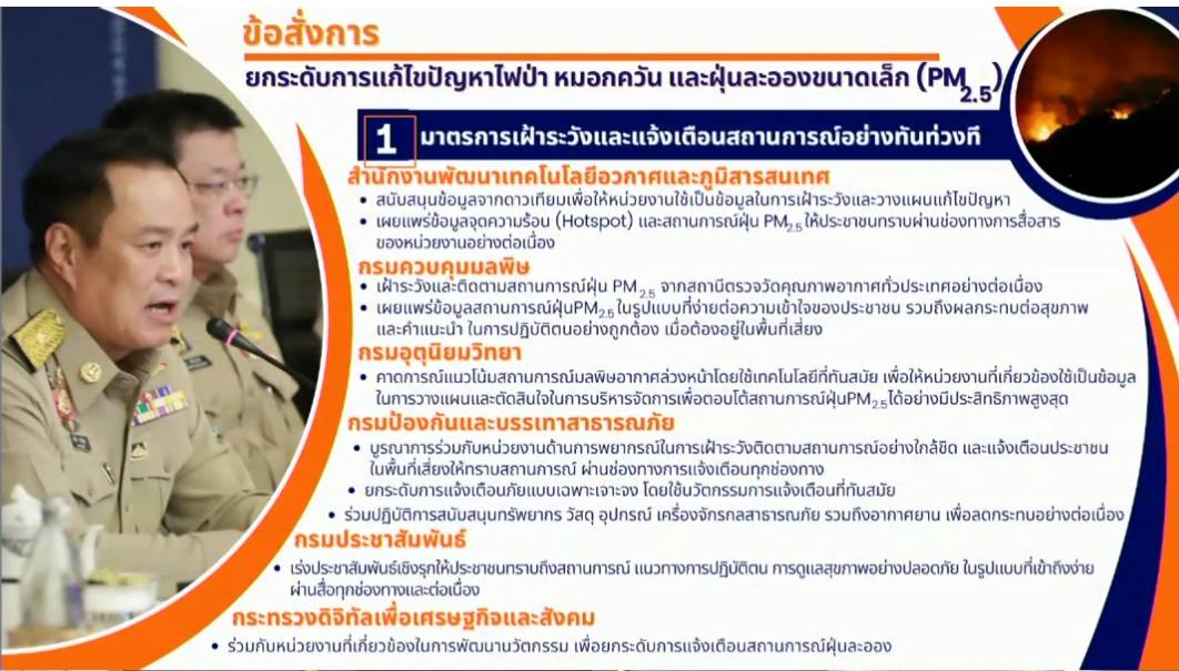 “3 เดือนนี้ห้ามเผา ทั้งเผาป่าเผาในที่โล่ง เผาทางการเกษตรไม่ว่าจะเป็นฟาง ซังข้าวโพดใบอ้อย การเผาถือว่าผิดกฎหมาย ต้องดำเนินคดี อย่าลืมว่าโทษรุนแรงไปถึงขั้นจำคุก ผู้ที่ยังฝ่าฝืนจะไม่ได้รับการช่วยเหลือใดๆจากรัฐ กรณีช่วยเหลือเยียวยาในโอกาสต่างๆในอนาคตท่านจะเสียสิทธิ์ตรงนั้นไป”