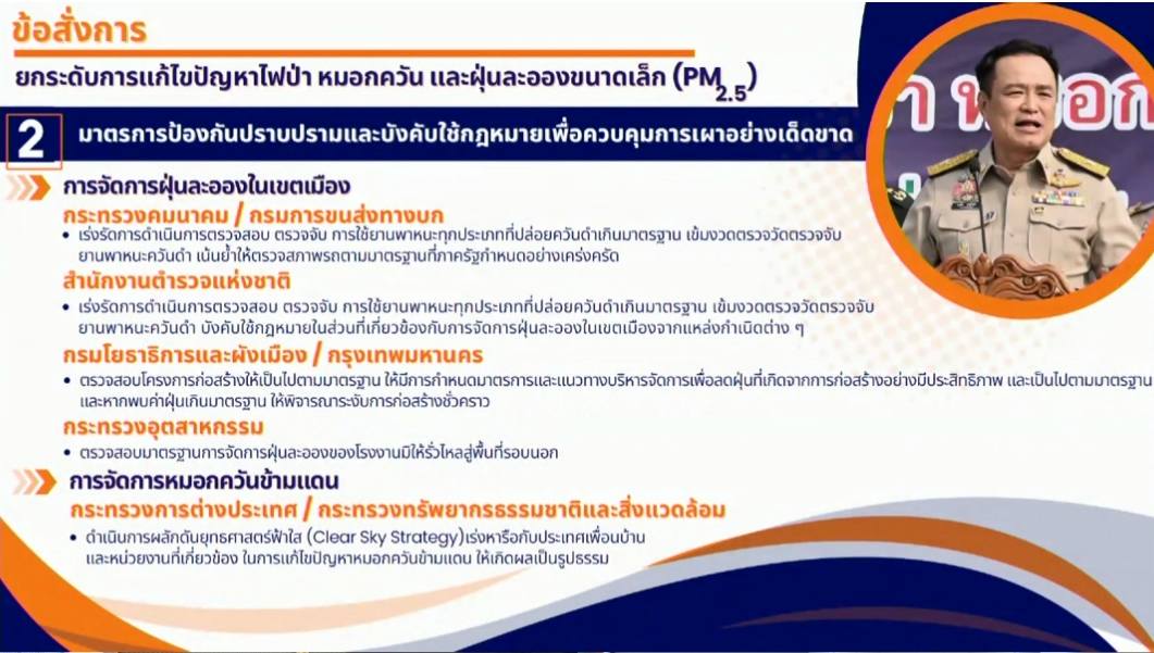 นายอนุทิน กล่าวภายหลังการประชุมว่า เราได้รับการสนับสนุนจากท่านนายกรัฐมนตรี นางสาวแพทองธาร ชินวัตร ในการร่วมกันแก้ไขสถานการณ์หมอกควัน ขณะที่ท่านไปประชุมต่างประเทศ ได้สั่งการให้ระดมสรรพกำลังแก้ไขปัญหานี้