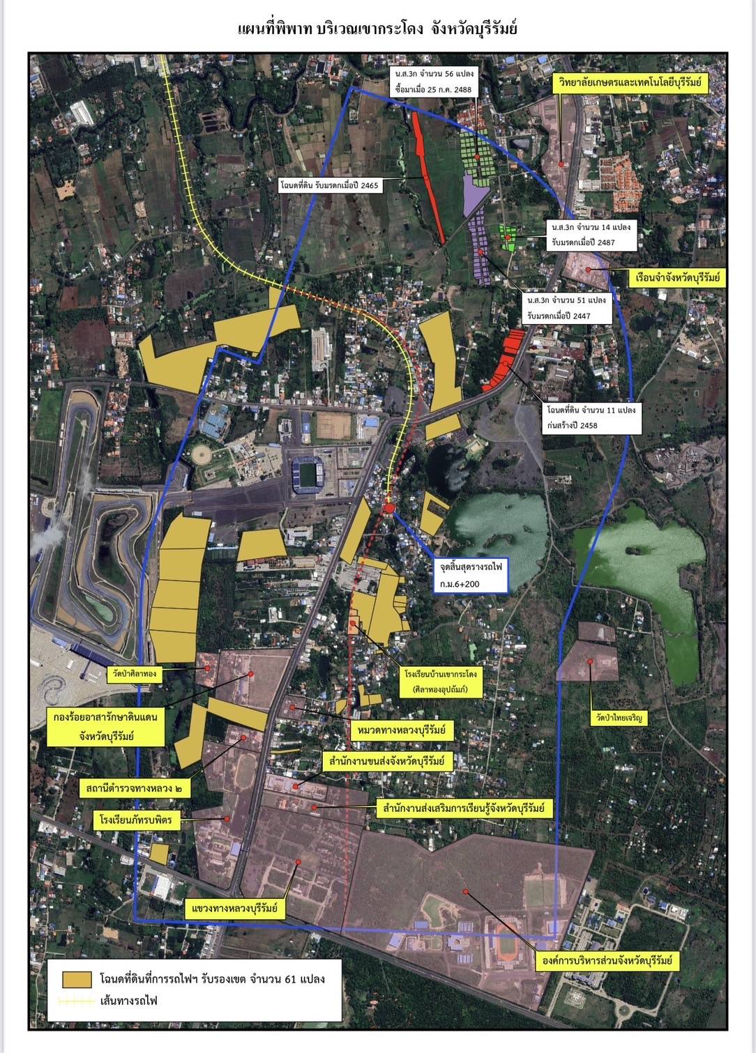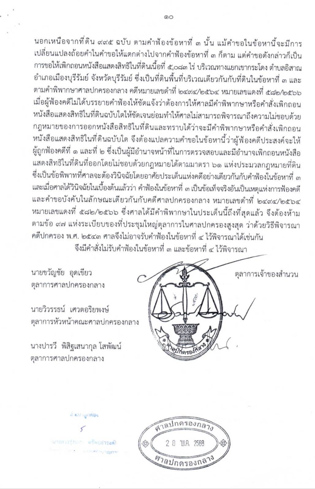ผู้สื่อข่าวรายงานว่า จากกรณีที่ ศาลปกครองกลาง ได้มีคำสั่งในคดีหมายเลขดำที่ 395/2568 ลงวันที่ 27 พ.ค.2568 ซึ่งเป็นคดีที่การรถไฟแห่งประเทศไทย (รฟท.) (ผู้ฟ้องคดี) ได้ยื่นฟ้อง กรมที่ดิน กับพวกรวม 3 ราย (ผู้ถูกฟ้องคดีที่ 1-3) ในคดีพิพาทเกี่ยวกับที่ดินบริเวณแยกเขากระโดง อ.เมือง จ.บุรีรัมย์ เนื้อที่ 5,083 ไร่ ซึ่งสรุปได้เป็น 4 ข้อหา คือ