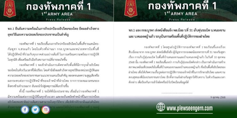 ขอเรียนชี้แจงภารกิจปกป้องอธิปไตยในพื้นที่ชายแดนไทย-กัมพูชา จ.สระแก้ว โดยในห้วงที่ผ่านมา