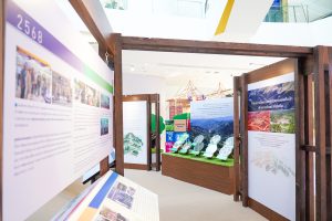 นอกจากนี้ ในนิทรรศการจะนำเสนอตัวอย่างของการนำประสบการณ์และความเชี่ยวชาญที่สั่งสมจนเกิดเป็นองค์ความรู้ และการต่อยอดพระราชปณิธาน “ปลูกป่า ปลูกคน” ซึ่งเป็นรากฐานการดำเนินงานของมูลนิธิแม่ฟ้าหลวงฯ และโครงการพัฒนาดอยตุง (พื้นที่ทรงงาน)ฯ ผ่าน “โครงการจัดการคาร์บอนเครดิตในป่าเพื่อการพัฒนาที่ยั่งยืน” โดยโครงการนี้ ใช้กลไก “คาร์บอนเครดิต”* เป็นเครื่องมือทางเศรษฐศาสตร์ในการเชื่อมชุมชนต้นน้ำที่อาศัยอยู่กับป่าชุมชน และภาคเอกชนที่ให้ความสำคัญกับการลดปริมาณการปล่อยก๊าซคาร์บอนไดออกไซด์ เพื่อให้เกิด Total Well-being กับทุกภาคส่วน โดยป่าได้รับการอนุรักษ์และฟื้นฟูให้ความหลากหลายทางชีวภาพกลับคืน ชุมชนได้รับการพัฒนาและปรับปรุงคุณภาพชีวิต และองค์กรธุรกิจได้บรรลุเป้าหมายการลดการปล่อยก๊าซเรือนกระจกและจากการปลูกป่ามากว่า 30 ปี บนพื้นที่ดอยตุง นับตั้งแต่สมเด็จพระศรีนครินทราบรมราชชนนี ทรงพลิกฟื้นพื้นที่เขาหัวโล้น และพื้นที่ปลูกฝิ่นดั้งเดิมให้กลายเป็นผืนป่า ความหลากหลายทางชีวภาพทั้งพืชและสัตว์ค่อยๆ กลับคืนมา พบพันธุ์ไม้ใหม่ของโลก รวมทั้งสัตว์เสี่ยงสูญพันธ์หลายชนิดในอนาคต สามารถนำไปต่อยอดผ่านกลไกตลาดที่เรียกว่า “เครดิตความหลากหลายทางชีวภาพ (biodiversity credits) หรือ “ไบโอเครดิต” เพื่อเป็นกลไกในการรักษาความหลากหลายทางชีวภาพ สามารถซื้อขายได้ โดยมีลักษณะคล้ายกับการซื้อขายคาร์บอนเครดิตซึ่งปัจจุบันอยู่ในขั้นตอนการวิจัย