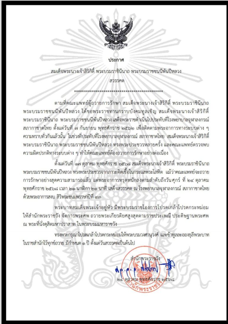 25 ตุลาคม 2568 – สำนักพระราชวัง เผยแพร่ประกาศ สมเด็จพระนางเจ้าสิริกิติ์ พระบรมราชินีนาถ พระบรมราชชนนีพันปีหลวง สวรรคต ความว่า