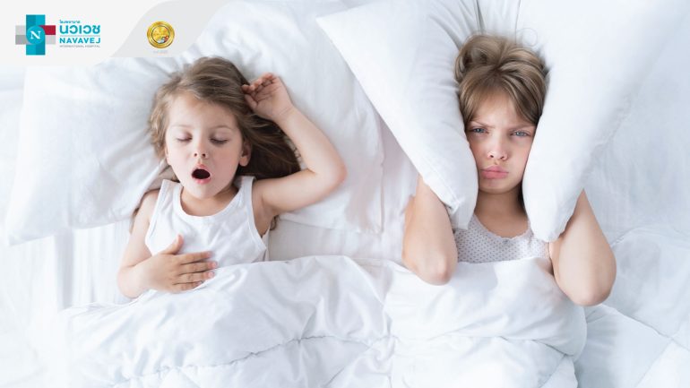เด็กจะนอนกรนเสียงดัง ในบางคนอาจมีภาวะหยุดหายใจจากภาวะทางเดินหายใจอุดกั้น ซึ่งถ้าลูกนอนกรนมาก อ้าปากหายใจ และมีจังหวะสะดุดตอนหลับ