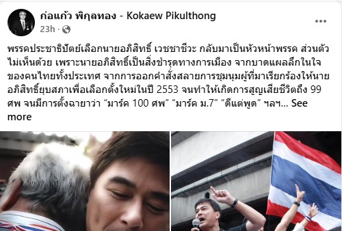 “พรรคประชาธิปัตย์เลือกนายอภิสิทธิ์ เวชชาชีวะ กลับมาเป็นหัวหน้าพรรค ส่วนตัวไม่เห็นด้วย เพราะนายอภิสิทธิ์เป็นสิ่งชำรุดทางการเมือง จากบาดแผลลึกในใจของคนไทยทั้งประเทศ