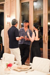 โดยการจัดงานเอ็กซ์คลูซีฟดินเนอร์เป็นไปอย่างเรียบง่ายด้วยใจที่นอบน้อม และปล่อยให้อาหารแต่ละจานบรรเลงรสชาติและทำหน้าที่แสดงเจตนารมณ์ของเชฟผู้ปรุง สายฝนที่โปรยปรายกลับช่วยเติมเต็มความโรแมนติกให้แก่ค่ำคืน เสียงอุทานเบาๆ เมื่อลิ้มรสชาติอาหารที่ถูกปากเหนือความคาดหมาย เคล้ากับเสียงหัวเราะขณะที่ยกจานกับข้าวส่งให้กัน เป็นความประทับใจที่ถูกถ่ายทอดพร้อมแบ่งปันประสบการณ์รสชาติให้แก่กัน อาหารแต่ละจานดูมีชีวิตชีวาเมื่อได้ฟังเชฟนก และ เชฟเดวิด เล่าถึงที่มา เทคนิคการปรุง และวัตถุดิบพิเศษหารับประทานยาก อย่างเป็นกันเอง ท่ามกลางบรรยากาศสวยงามบนจุดสูงสุดของเกาะส่วนตัว โอบล้อมด้วยทะเลสีครามของอ่าวไทยซึ่งเป็นที่ตั้งของ ห้องอาหารล่องใต้ จุดหมายปลายทางที่ได้รับการแนะนำบนคู่มือ มิชลินไกด์ ฉบับประเทศไทย 2024 และ 2025 ห้อมล้อมอบอุ่นด้วยแขกคนสำคัญ อาทิ หฤทยา ไชยนุวัติ, อธิสิทธิ์ ไชยนุวัติ, ทนงศักดิ์ ยอดหวาย และนักท่องเที่ยวจากหลากหลายประเทศ เคล้าคลอไปกับการดื่มด่ำค็อกเทลแก้วพิเศษรังสรรค์มาเฉพาะสำหรับค่ำคืนนี้เท่านั้น ซึ่งมีให้เลือกจิบระหว่างสองเมนูด้วยกัน ได้แก่ ซ่อนกลิ่น ที่มอบความสดชื่นผสมผสานกับรสชาติของสมุนไพรไทยอย่างตะไคร้ได้เป็นอย่างดี และอีกแก้ว Spicy Paloma ที่มีรสชาติอันเป็นเอกลักษณ์ของส้มโอและสอดแทรกความเผ็ดร้อนเบา ๆ ไว้อย่างลงตัว เป็นการเริ่มเปิดต่อมรับรสชาติสุดประทับใจก่อนจะเดินทางเข้าสู่มื้ออาหารสุดพิเศษของเชฟทั้งสอง