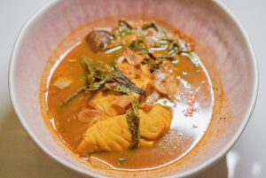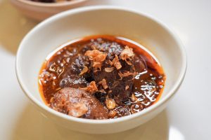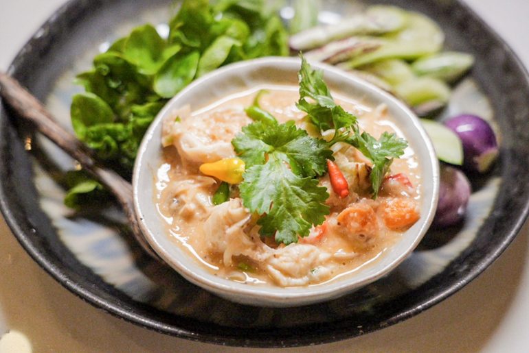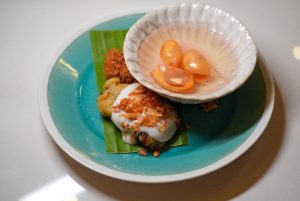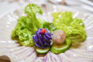 มื้อค่ำสุดเอ็กซ์คลูซีฟที่ได้รับแรงบันดาลใจจากหนังสือ Kalaya’s Southern Thai Kitchen: A Cookbook ของเชฟนก สุนทรนนท์ ถ่ายทอดออกมาเป็นรสชาติอาหารใต้แท้ ๆ ที่ออกมาจากความทรงจำ ผสมผสานด้วยเทคนิคและความประณีตเฉพาะตัวของเชฟทั้งสองท่าน เริ่มต้นด้วยความประทับใจตั้งแต่คำแรก โดยมีเมนูเรียกน้ำย่อยยอดนิยมจากร้านอาหารไทย Kalaya มาเป็นการเปิดต่อมรับรส ได้แก่ สาคูไส้ปลา เมนูเรียกน้ำย่อยตำรับใต้ ไส้แน่น รสชาติกลมกล่อมพอดีคำ และ ช่อม่วงไส้ไก่ ของว่างไทยโบราณ โดยเชฟนกเป็นผู้ลงมือจับจีบรูปดอกไม้สีม่วงเองอย่างสวยงาม พร้อมไส้รสชาติเข้มข้นละเมียดละไม หอมกรุ่นเครื่องเทศและพริกไทย โดยเมนูนี้ได้เสิร์ฟขึ้นโต๊ะที่ร้านอาหารไทย Kalaya ไม่ต่ำกว่า 800 ชิ้นต่อวัน