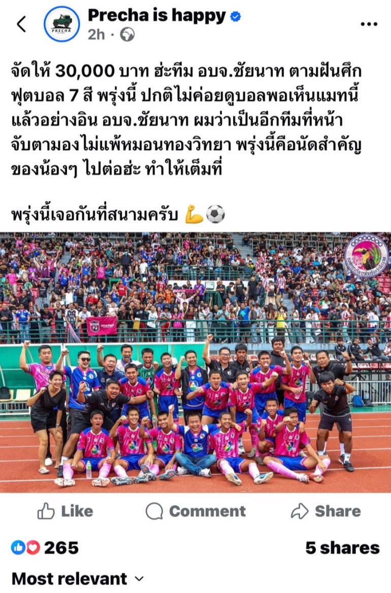 พร้อมข้อความระบุว่า “จัดให้ 30,000 บาท ฮ่ะทีม อบจ.ชัยนาท ตามฝันศึกฟุตบอล 7 สี พรุ่งนี้ ปกติไม่ค่อยดูบอลพอเห็นแมทนี้แล้วอย่างอิน อบจ.ชัยนาท ผมว่าเป็นอีกทีมที่หน้าจับตามองไม่แพ้หมอนทองวิทยา พรุ่งนี้คือนัดสำคัญของน้องๆ ไปต่อฮ่ะ ทำให้เต็มที่ และพรุ่งนี้เจอกันที่สนามครับ”