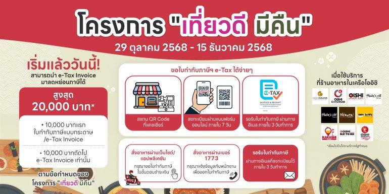 สายอาหารญี่ปุ่นห้ามพลาด !!! อิ่ม ฟิน อาหารญี่ปุ่น…ทุกวัน พร้อมรับสิทธิประโยชน์ทางภาษีผ่านโครงการ เที่ยวดี มีคืน 2568 ได้ที่ร้านอาหารญี่ปุ่นในเครือโออิชิ ทุกร้าน ทุกสาขา รวมถึงบริการจัดส่งอาหาร โออิชิ เดลิเวอรี่ ตั้งแต่ 29 ตุลาคม 2568 – 15 ธันวาคม 2568 เท่านั้น