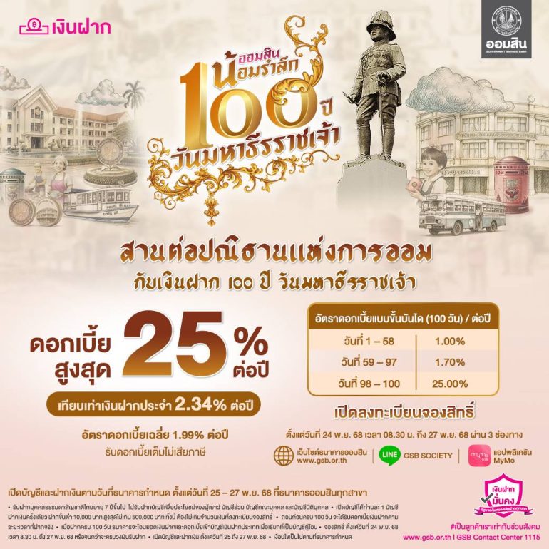 21 พฤศจิกายน 2568 เนื่องในวาระครบรอบ 100 ปี วันสวรรคตพระบาทสมเด็จพระมงกุฎเกล้าเจ้าอยู่หัว ธ.ออมสินออกผลิตภัณฑ์เงินฝากเผื่อเรียกพิเศษ “เงินฝาก 100 ปี วันมหาธีรราชเจ้า” โดยเป็นผลิตภัณฑ์สำหรับผู้ที่ต้องการออมเงินระยะสั้นพร้อมรับผลตอบแทนที่เพิ่มขึ้นตามช่วงเวลา