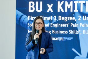 “ม.กรุงเทพได้ร่วมมือกับสถาบันเทคโนโลยีพระจอมเกล้าเจ้าคุณทหารลาดกระบัง (สจล.) สร้างหลักสูตรที่ผสมผสานความรู้ด้านวิศวกรรม AI เข้ากับทักษะการเป็นผู้ประกอบการ โดยใช้ปรัชญา “ล้มให้เร็ว เรียนรู้ให้เร็ว” (fail fast, learn fast) ทำให้นักศึกษาได้เริ่มสร้างไอเดียธุรกิจและออกไปพูดคุยกับลูกค้าตัวจริงตั้งแต่ปี 1 พวกเขาไม่ได้เรียนแค่ทฤษฎี แต่เรียนรู้จากโลกการทำงานจริงๆ ผ่านการลงมือทำและแก้ไขปัญหาซ้ำแล้วซ้ำเล่าตลอด 4 ปี” อ.ภัทรารัตน์ กล่าว