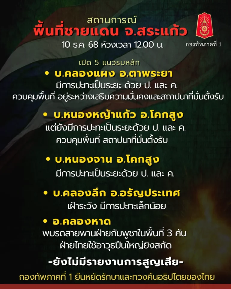 10 ธันวาคม 2568 – กองทัพภาคที่1 รายงานสถานการณ์พื้นที่ชายแดน จ.สระแก้ว10 ธ.ค. 68 ห้วงเวลา 12.00 น.เปิด 5 แนวรบหลัก
