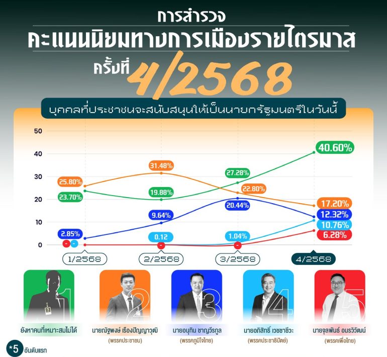 “นิด้าโพล” สำรวจความคิดเห็น ‘เท้ง’ คะแนนนำ ‘อนุทิน’ ประชาชนหนุนนั่งนายก