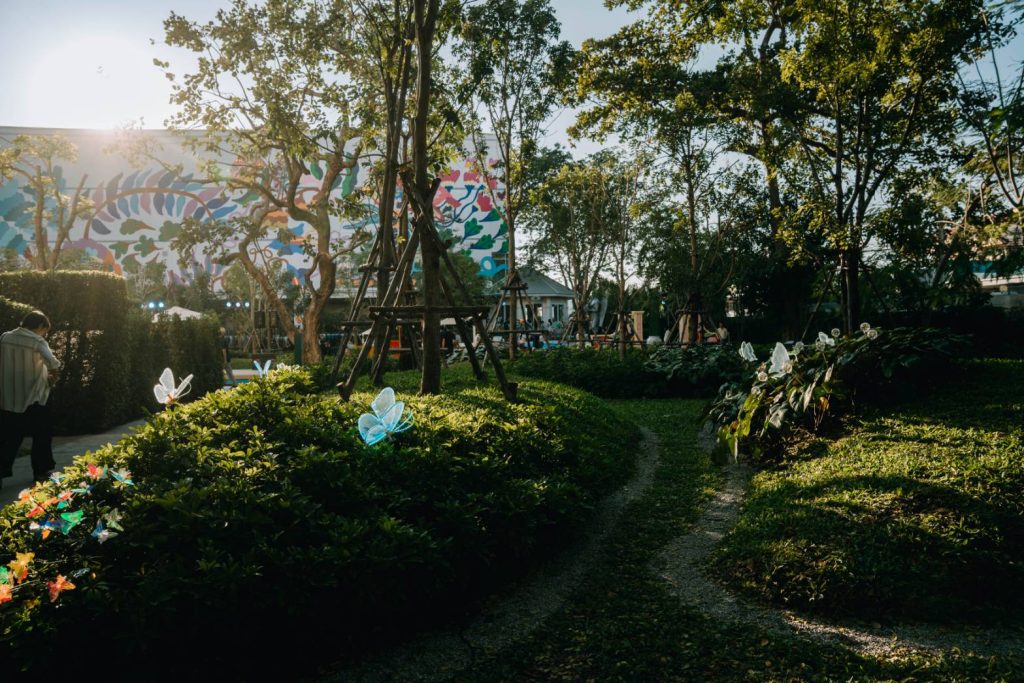 1) กำแพงพฤกษา “The Wall” ผลงานของ นุ่น นววรรณ โตวิเศษ กับศิลปะภาพวาดบนฝาผนัง Mural Art ขนาดกว่า 3,000 ตารางเมตร ถ่ายทอดความงามของพรรณไม้เลื้อยและระบบนิเวศแห่งจินตนาการราวกับมีชีวิต ลวดลายพืชพันธุ์ที่พลิ้วไหวดั่งกำลังเต้นตามสายลม นำเสนอสีสันอันสดใสที่ช่วยปลุกพลังบวกและสร้างสุนทรียะใหม่ให้กับสถาปัตยกรรมและพื้นที่สวน นับเป็นอีกหนึ่งองค์ประกอบที่ทำให้พื้นที่แห่งนี้โดดเด่นและมีเอกลักษณ์เฉพาะตัว