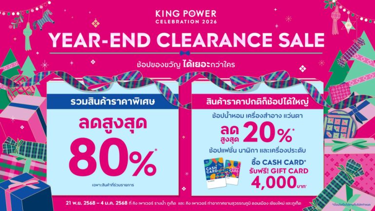 คิง เพาเวอร์ จัดแคมเปญสุดยิ่งใหญ่ส่งท้ายปี “YEAR – END CLEARANCE SALE” พบกับสินค้าสุดเอ็กซ์คลูซิฟจากแบรนด์ดัง ลดกระหน่ำสูงสุดถึง 80% เอาใจทุกไลฟ์สไตล์ ทั้งแฟชั่น น้ำหอม เครื่องสำอาง และอีกมากมายที่ร่วมรายการ ตั้งแต่วันที่ 21 พฤศจิกายน 2568 – 4 มกราคม 2569 พบกับโซนสินค้า YEAR END CLEARANCE SALE ได้ที่บริเวณ HALLWAY คิง เพาเวอร์ รางน้ำ ช้อปก่อน คุ้มก่อน ของมีจำนวนจำกัด!