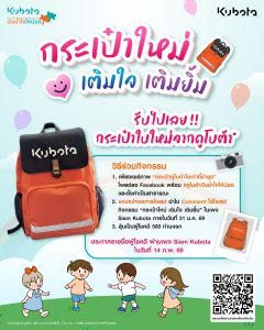 บริษัท สยามคูโบต้าคอร์ปอเรชั่น จำกัด เดินหน้าส่งเสริมโอกาสทางการศึกษาแก่เยาวชนไทยอย่างต่อเนื่อง จัดกิจกรรมต้อนรับวันเด็กแห่งชาติ ประจำปี 2569 ภายใต้โครงการ “คูโบต้า ปันน้ำใจให้น้อง” ตอกย้ำความมุ่งมั่นในการส่งเสริมโอกาสทางการศึกษาและยกระดับคุณภาพชีวิต เพื่อร่วมสร้างอนาคตที่ยั่งยืนของเยาวชนไทย โดยเชิญชวนน้อง ๆ ร่วมสนุกกับกิจกรรม “กระเป๋าใหม่ เติมใจ เติมยิ้ม” พร้อมรับสิทธิ์ลุ้นเป็น 1 ใน 500 ผู้โชคดี รับกระเป๋า “คูโบต้า ปันน้ำใจให้น้อง” ใบใหม่ มูลค่า 200 บาท จำกัดสิทธิ์ 1 คน ต่อ 1 โพสต์ ตลอดระยะเวลากิจกรรม* ตั้งแต่วันที่ 6– 31 มกราคม 2569 และจะประกาศรายชื่อผู้ได้รับการคัดเลือกในวันที่ 14 กุมภาพันธ์ 2569 ผ่านเพจเฟซบุ๊ก SIAMKUBOTA https://www.facebook.com/SiamKubotaClub เพียงทำตามกติกาง่าย ๆ ดังนี้