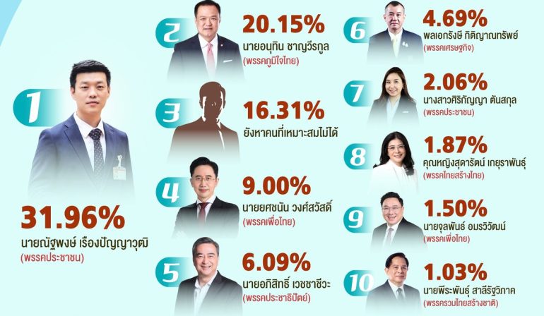 จากการสำรวจเมื่อถามถึงบุคคลที่คนสมุทรปราการจะสนับสนุนให้เป็นนายกรัฐมนตรีในวันนี้ พบว่า อันดับ 1 ร้อยละ 31.96 ระบุว่าเป็น นายณัฐพงษ์ เรืองปัญญาวุฒิ (พรรคประชาชน) อันดับ 2 ร้อยละ 20.15 ระบุว่าเป็น นายอนุทิน ชาญวีรกูล (พรรคภูมิใจไทย) อันดับ 3 ร้อยละ 16.31 ระบุว่า ยังหาคนที่เหมาะสมไม่ได้ อันดับ 4 ร้อยละ 9.00 ระบุว่าเป็น นายยศชนัน วงศ์สวัสดิ์ (พรรคเพื่อไทย) อันดับ 5 ร้อยละ 6.09 ระบุว่าเป็น นายอภิสิทธิ์ เวชชาชีวะ (พรรคประชาธิปัตย์) อันดับ 6 ร้อยละ 4.69 ระบุว่าเป็น พลเอกรังษี กิติญาณทรัพย์ (พรรคเศรษฐกิจ) อันดับ 7 ร้อยละ 2.06 ระบุว่าเป็น นางสาวศิริกัญญา ตันสกุล (พรรคประชาชน) อันดับ 8 ร้อยละ 1.87 ระบุว่าเป็น คุณหญิงสุดารัตน์ เกยุราพันธุ์ (พรรคไทยสร้างไทย) อันดับ 9 ร้อยละ 1.50 ระบุว่าเป็น นายจุลพันธ์ อมรวิวัฒน์ (พรรคเพื่อไทย) อันดับ 10 ร้อยละ 1.03 ระบุว่าเป็น นายพีระพันธุ์ สาลีรัฐวิภาค (พรรครวมไทยสร้างชาติ) และร้อยละ 5.15 ระบุอื่น ๆ ได้แก่ พลตำรวจเอก เสรีพิศุทธ์ เตมียเวส (พรรคเสรีรวมไทย) นายวีระยุทธ กาญจน์ชูฉัตร (พรรคประชาชน) ดร.สุชัชวีร์ สุวรรณสวัสดิ์ (พรรคไทยก้าวใหม่) นายสุริยะ จึงรุ่งเรืองกิจ (พรรคเพื่อไทย) นายแพทย์วรงค์ เดชกิจวิกรม (พรรคไทยภักดี) พลเอกประยุทธ์ จันทร์โอชา นายมงคลกิตติ์ สุขสินธารานนท์ (พรรคทางเลือกใหม่) ร้อยเอกธรรมนัส พรหมเผ่า (พรรคกล้าธรรม) พลโทภราดร พัฒนถาบุตร (พรรคไทยสร้างไทย) นายสีหศักดิ์ พวงเกตุแก้ว (พรรคภูมิใจไทย) นายสุรเดช ทวีแสงสกุลไทย (พรรคไทยสร้างไทย) นายชวน หลีกภัย (พรรคประชาธิปัตย์) และไม่ประสงค์ลงคะแนน (Vote No) และร้อยละ 0.19 ระบุว่า ไม่ตอบ/ไม่สนใจ