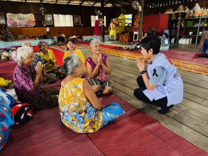 “ที่ตำบลโนนหมากนุ่น เรามีการสร้างชุมชนพร้อมรับภัยค่ะ ตอนแรกเราเริ่มจากน้ำท่วม ก็จะกำหนดจุดปลอดภัยที่เขาจะต้องไปรวมพล แล้วเราก็ให้ความช่วยเหลือในเบื้องต้น มีการซ้อม วัดเวลา วัดระยะทางอย่างจริงจังว่า แต่ละบ้านให้ไปเส้นทางไหน ไปกับใคร แล้ววันนี้ที่มีความไม่สงบชายแดนเกิดขึ้น ก็เลยใช้ช่องทางการสื่อสารเดิม และการจัดการได้เป็นระบบมาก เขาจะอพยพไปอยู่ตามจุดของเขา แล้วก็มีเจ้าหน้าที่ไปดูแลในศูนย์ของแต่ละศูนย์ที่เขาตั้งขึ้นไว้”
