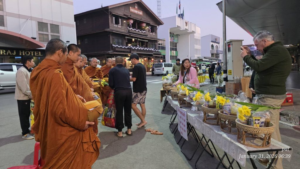 ตี ๕ ครึ่ง รีบตื่น อาบน้ำ-อาบท่า ลงมารอใส่บาตรตอน ๖ โมงเช้า มีพระ ๒ รูปเดินผ่านหน้าโรงแรมพอดี