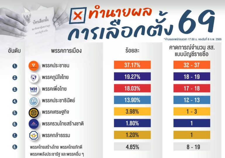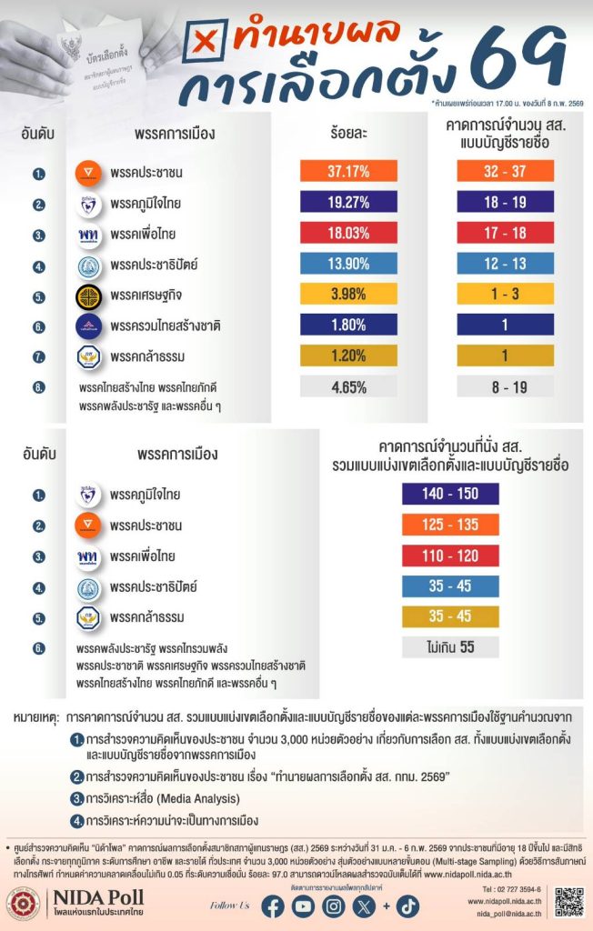 8 กุมภาพันธ์ 2569 เวลา 17.00 น. ศูนย์สำรวจความคิดเห็น “นิด้าโพล” สถาบันบัณฑิตพัฒนบริหารศาสตร์ (นิด้า) คาดการณ์ผลการเลือกตั้งสมาชิกสภาผู้แทนราษฎร (สส.) 2569 ประกอบด้วยวิธีการ คือ