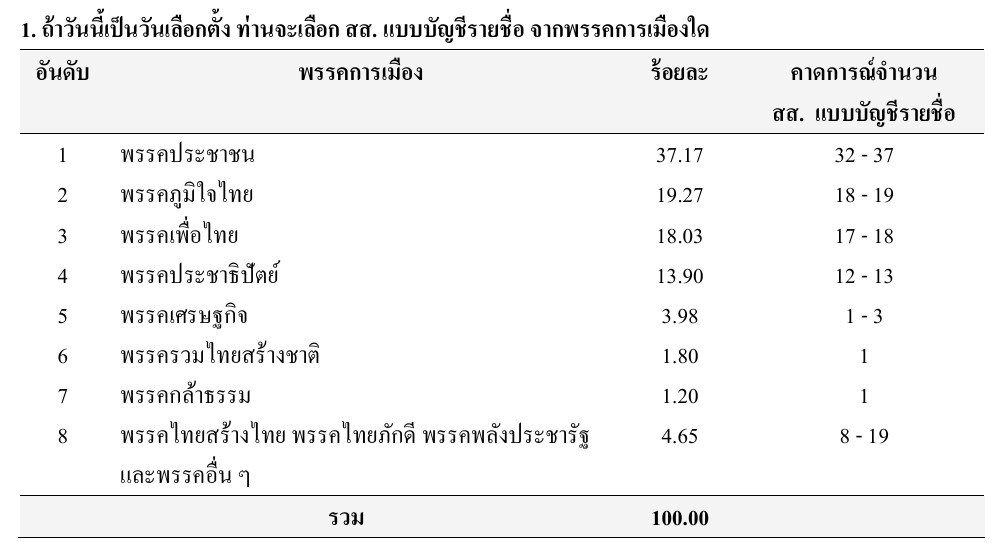 1. การสำรวจความคิดเห็นของประชาชน จำนวน 3,000 หน่วยตัวอย่าง เกี่ยวกับการเลือก สส. ทั้งแบบแบ่งเขตเลือกตั้งและแบบบัญชีรายชื่อจากพรรคการเมือง