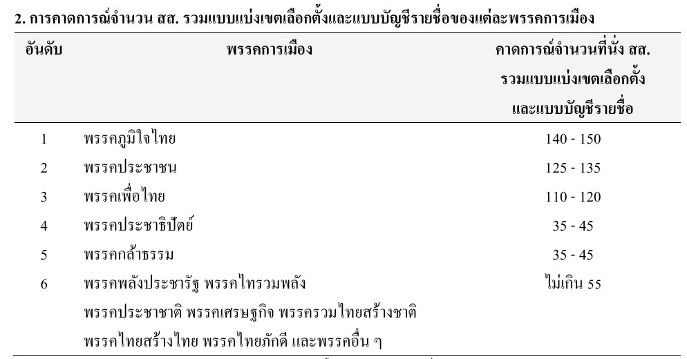 หมายเหตุ: การคาดการณ์จำนวน สส. รวมแบบแบ่งเขตเลือกตั้งและแบบบัญชีรายชื่อของแต่ละพรรคการเมืองใช้ฐานคำนวณจาก