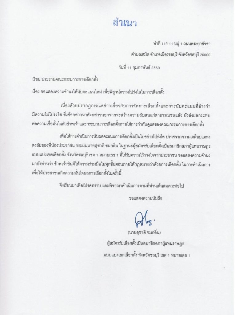 11 กุมภาพันธ์ 2569 เวลา 13.30 น. นายสุชาติ ชมกลิ่น ผู้สมัครรับเลือกตั้งสมาชิกสภาผู้แทนราษฎร แบบแบ่งเขตเลือกตั้ง จังหวัดชลบุรี เขต 1 หมายเลข 1 ลงนามในหนังสือถึงคณะกรรมการการเลือกตั้ง (กกต.) ขอให้ดำเนินการนับคะแนนเลือกตั้งใหม่ในเขตเลือกตั้งที่ 1 อำเภอเมืองชลบุรี ครอบคลุมพื้นที่ 8 ตำบล ภายใต้กรอบกฎหมายที่เกี่ยวข้อง