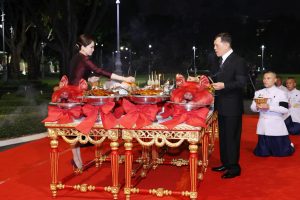 ในการนี้ พระบาทสมเด็จพระเจ้าอยู่หัว ทรงจุดเทียนทอง เทียนเงิน ธูป ที่โต๊ะเครื่องสังเวย ทรงจุดธูปหางแล้วทรงปักที่เครื่องสังเวย สมเด็จพระนางเจ้า ฯ พระบรมราชินี ทรงจุดธูปหางแล้วทรงปักที่เครื่องสังเวย จากนั้น พระบาทสมเด็จพระเจ้าอยู่หัว และสมเด็จพระนางเจ้า ฯ พระบรมราชินี ทรงจุดธูปเทียนเครื่องทองน้อยถวายสักการะสิ่งศักดิ์สิทธิ์ ทรงกราบ เสร็จแล้ว ทรงเผากระดาษเงิน กระดาษทอง สมควรแก่เวลา จึงเสด็จขึ้นพระที่นั่งอัมพรสถาน พระราชวังดุสิต