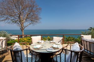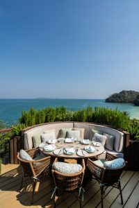 ห้องอาหารท็อป ออฟ เดอะ รีฟ โฉมใหม่ มาในดีไซน์ที่อบอวลไปด้วยความสดชื่น สบายตา เน้นโทนสีฟ้าที่ได้รับแรงบันดาลใจจากทะเลอันดามันมาเป็นส่วนหนึ่งขององค์ประกอบหลัก ไม่ว่าจะเป็นโซฟา เบาะเก้าอี้ หมอนอิง ไปจนถึงภาพวาดขนาดใหญ่บนผนัง ผสมผสานกับสีเอิร์ธโทนของโต๊ะและเก้าอี้ไม้ โคมไฟตั้งโต๊ะวางเรียงราย ล้อมด้วยแผ่นแก้วสวยสะดุดตายามต้องแสงไฟดูสดใสราวกับพยับแดดที่ล้อไปกับคลื่นทะเล ให้ความรู้สึกเหมือนกำลังพักผ่อนท่ามกลางแสงแดดและสายลมแห่งท้องทะเลเมดิเตอร์เรเนียน เข้ากับอาหารสไตล์เมดิเตอร์เรเนียนอย่างกลมกลืน มีที่นั่งอินดอร์กว่า 50 ที่นั่ง และพื้นที่เอาท์ดอร์อีก 20 ที่นั่งสำหรับผู้ที่อยากใกล้ชิดธรรมชาติ รับลมทะเลเบา ๆ พร้อมชมวิวตระการตาของมหาสมุทรสุดกว้างไกลโดยไม่มีอะไรบดบังสายตา ส่วน ออตเตอร์ บาร์ ซึ่งตั้งอยู่ในอีกมุมหนึ่งของห้องอาหารที่เชื่อมต่อกันเป็นหนึ่งเดียว ก็มาพร้อมกับรูปลักษณ์ชวนสะดุดตา ด้วยการหยิบเอากระเบื้องสีฟ้าอ่อนสดใสมาร้อยเรียงประสานกันจนออกมาเป็นลวดลายประณีตงดงามคล้ายกับเกล็ดปลาที่กำลังแหวกว่ายในมหาสมุทร พร้อมที่นั่งให้เอนกายพักผ่อนพร้อมเครื่องดื่มแก้วโปรดกว่า 20 ที่นั่ง และเพลิดเพลินไปกับการบรรเลงเปียโนพร้อมขับกล่อมบทเพลงอันไพเราะจากนักร้องมืออาชีพ