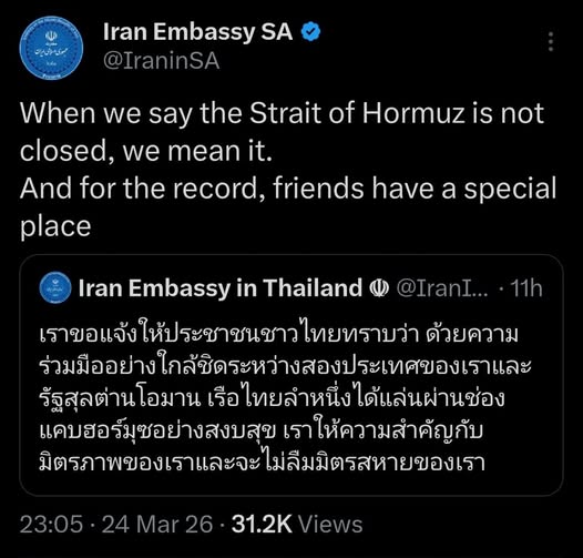 “….เราขอแจ้งให้ประชาชนชาวไทยทราบว่า ด้วยความร่วมมืออย่างใกล้ชิดระหว่างสองประเทศของเราและรัฐสุลต่านโอมาน เรือไทยลำหนึ่งได้แล่นผ่านช่องแคบฮอร์มุซอย่างสงบสุข เราให้ความสำคัญกับมิตรภาพของเราและจะไม่ลืมมิตรสหายของเรา….”