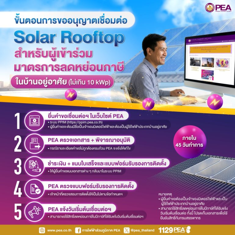 การไฟฟ้าส่วนภูมิภาค (PEA) แนะนำขั้นตอนการขออนุญาตเชื่อมต่อระบบผลิตไฟฟ้าพลังงานแสงอาทิตย์บนหลังคา (Solar Rooftop) สำหรับผู้ใช้ไฟฟ้าประเภทบ้านอยู่อาศัย ที่ประสงค์เข้าร่วมมาตรการลดหย่อนภาษี โดยกำหนดขนาดติดตั้งไม่เกิน 10 kWp ดังนี้