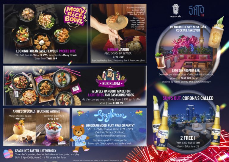 ในวันที่ 5 เมษายน โรงแรมฯ ต้อนรับช่วงเวลาแห่งฤดูกาลอีสเตอร์ด้วยกิจกรรม “Crack into Easter” พร้อมเมนูพิเศษที่คัดสรรโดยเชฟ และกิจกรรมสำหรับครอบครัว อาทิ เกมล่าไข่อีสเตอร์และกิจกรรมระบายสี ระหว่างเวลา 14.00–18.00 น. ที่ม็อกซี่ บาร์ แอนด์ เรสเตอรองต์ ชั้น 9
