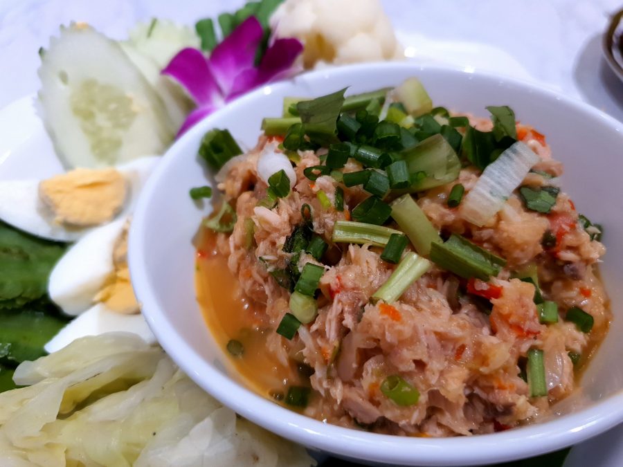 สำหรับอาหารจานหลักขอแนะนำให้สั่งมาชิมคือ น้ำพริกปลาทูน่า จะสั่งมานั่งกินเล่นๆ หรือกินกับข้าวสวยร้อนๆ ก็จะอร่อย เพราะเชฟโจ้จะนำสมุนไพรต่างๆ ทั้งหอมแดง กระเทียม พริกขี้หนู มะเขือเทศ และเนื้อปลาทูน่าอย่างดี มาตำคลุกรวมกันเป็นน้ำพริกกินกับผักสด ผักลวกและไข่ต้ม ยิ่งกินก็ยิ่งเพลินครับ