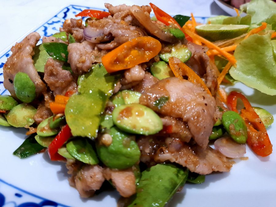เวลากินต้องตักรวมกันทั้งหมูสามชั้นที่มีรสชาติมันๆ หวานๆ กรุบๆ บวกกับความมันขมเล็กน้อยจากสะตอและความเผ็ดร้อนจากเครื่องปรุงก็จะเข้ากันได้อย่างไม่มีที่ติเชียว