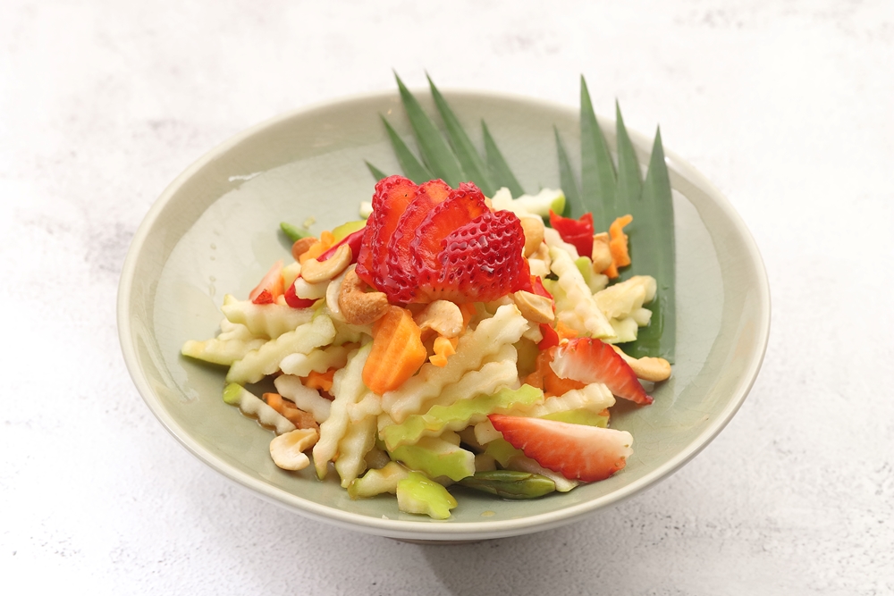 “ผัดไทยเจ” ราคา 159 บาท ใช้ซอสผัดไทยสูตรพิเศษผัดกับเต้าหู้และผักนานาชนิด “ขนมเบื้องญวณเจ” ราคา 179 บาท ขนมเบื้องเจแป้งกรอบๆ พร้อมไส้ผักและเต้าหู้ “ตำแซ่บข้าวโพดสามสีกับควินัว” ราคา 149 บาท เมนูรสแซ่บจากข้าวโพดสามสีตำกับควินัว เสิร์ฟในกระทงกรอบ “ส้มตำสตรอเบอร์รี่กับแอปเปิล” ราคา 149 บาท “ข้าวผัดสับปะรด” ราคา 159 บาท
