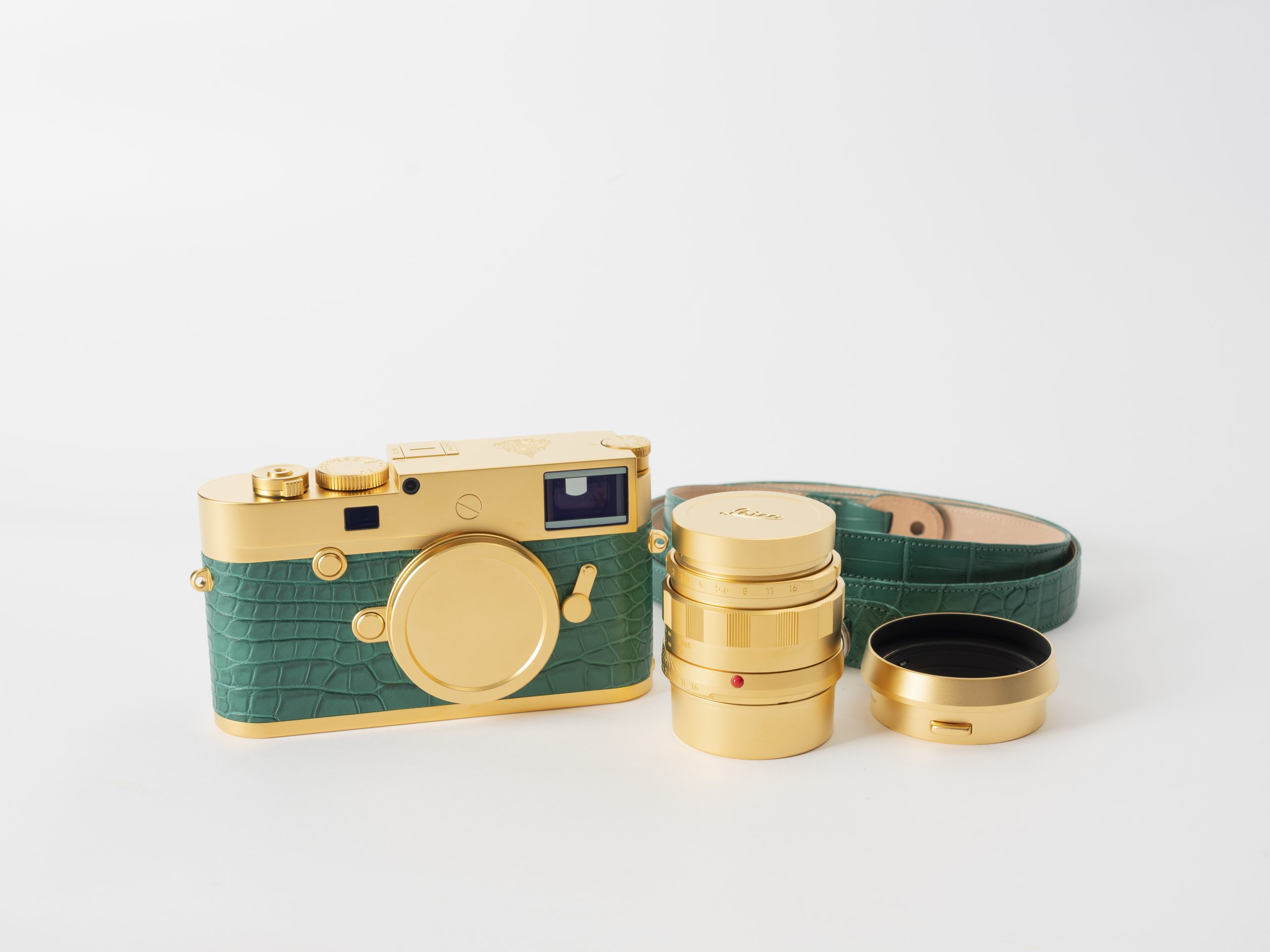 คือ ชุดสองเลนส์ ประกอบด้วย กล้องดิจิทัล Leica M 10-P ชุบทองคำ หุ้มหนังจระเข้สีเหลือง พร้อมเลนส์ APO Summicron M 1:2/50 และเลนส์ Summilux M 1:1.4/35 ASPH