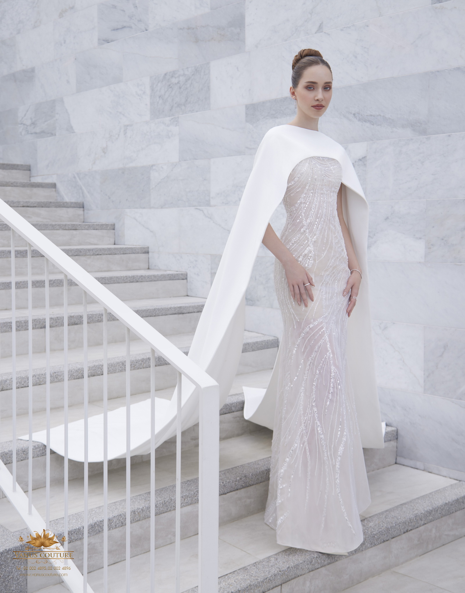 แพทเทิร์นดูโดดเด่นโอบรับสรีระได้อย่างพอดิบพอดีเน้นสัดส่วนให้ดูเป็นผู้หญิงมากขึ้น เผยให้เห็นช่วงอก คอ และ ไหล่ ให้ความรู้สึกเซ็กซี่เบา ๆ เพิ่มความหรูหราด้วยผ้าคลุมไหล่และกระโปรงทรงเมอร์เมดคอมพลีตลุคเรียบหรูได้อย่างลงตัว ถึงแม้ชุดจะดูเรียบง่ายให้ลุคคูล ๆ ดูคลาสสิกแต่ผู้สวมใส่ก็สามารถโดดเด่นมีออร่าสะดุดตาราวกับเจ้าหญิงได้เช่นกัน