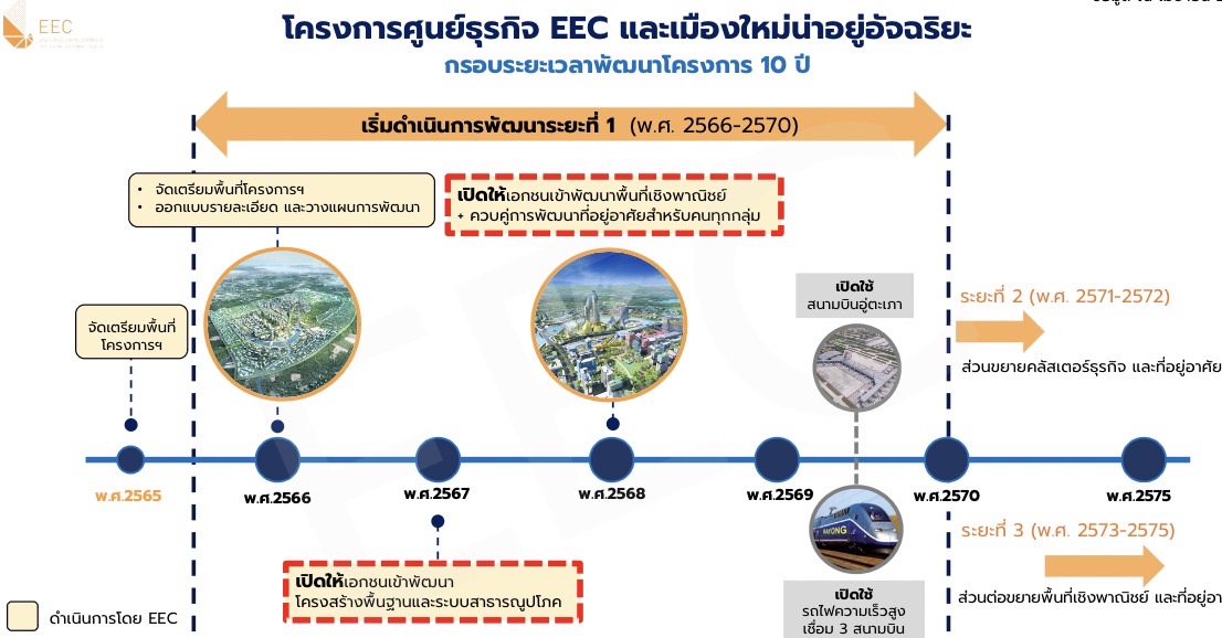 น.ส.ทิพานัน กล่าวว่า ปัจจุบันปี 2565 อยู่ระหว่างการจัดเตรียมพื้นที่ และภายในปี 2566 เปิดให้เอกชนเข้าพัฒนาพื้นที่เชิงพาณิชย์ ส่วนโครงสร้างพื้นฐานและสาธารณูปโภคจะเปิดให้เข้ามาพัฒนาในปี 2567 เพื่อรองรับประชากรได้ 300,000 คน และประมาณการว่าจะมีประชากรเข้ามาอาศัยเพิ่มมากกว่า 1.5 ล้านคนในอนาคต คาดว่าจะสามารถสร้างมูลค่าผลิตภัณฑ์มวลรวมของประเทศ ( GDP) ได้กว่า 2 ล้านล้านบาท ซึ่งจะนำมาสู่การสร้างรายได้ และการจ้างงาน ถือเป็นการวางรากฐานให้เศรษฐกิจไทยเจริญเติบโตแบบก้าวกระโดดและยั่งยืน