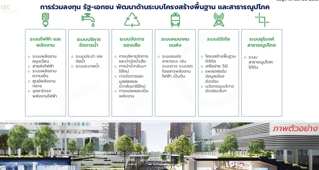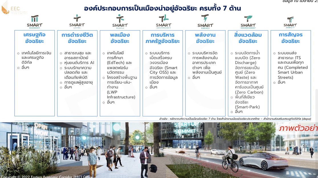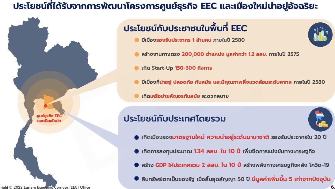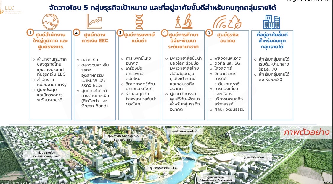 ดำเนินโครงการศูนย์ธุรกิจ EEC และเมืองใหม่น่าอยู่อัจฉริยะ เป็น “ศูนย์กลางธุรกิจและการเงินระดับภูมิภาค” เป็นแหล่งที่อยู่อาศัยแห่งอนาคต โดยธรรมชาติ มนุษย์ และเทคโนโลยีอยู่ร่วมกันมุ่งสู่เศรษฐกิจชีวภาพ เศรษฐกิจหมุนเวียน เศรษฐกิจสีเขียว (BCG Economy)