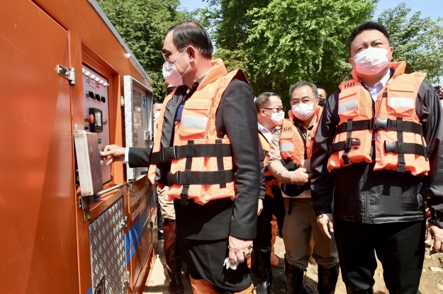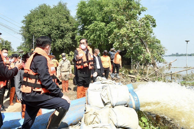 นายกฯ ลงเรือพบปะให้กำลังใจประชาชนที่ประสบอุทกภัย ต.บางกระบือ อ.เมือง จ.สิงห์บุรี กดปุ่มเดินเครื่องสูบน้ำ เร่งระบายน้ำออกจากพื้นที่บ้านเรือนประชาชนลงสู่แม่น้ำเจ้าพระยา ประชาชนขอบคุณนายกฯ มาเยี่ยมให้กำลังใจ