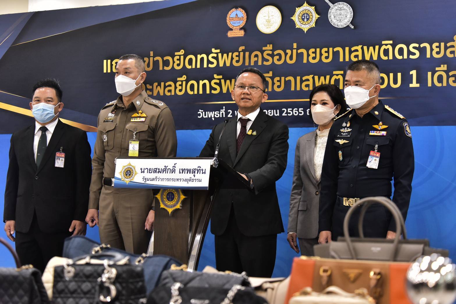 เมื่อเวลา 09.00 น. ที่สำนักงานคณะกรรมการป้องกันและปราบปรามยาเสพติด (ป.ป.ส ) มีการแถลงข่าวยึดทรัพย์เครือข่ายยาเสพติดรายสำคัญ และผลการยึดทรัพย์คดียาเสพติด รอบ 1 เดือน โดยมี นายสมศักดิ์ เทพสุทิน รัฐมนตรีว่าการกระทรวงยุติธรรมเป็นประธาน พร้อมด้วย น.ส.ณัฐธ์ภัสส์ ยงใจยุทธ ผู้ช่วย รมว.ยุติธรรม นายวิชัย ไชยมงคล เลขาธิการ ป.ป.ส พล.ต.ต.นิธิธร จินตกานนท์ รอง ผบช.น และนายปิยะศิริ วัฒนวรางกูร รองเลขาธิการ ป.ป.ส.