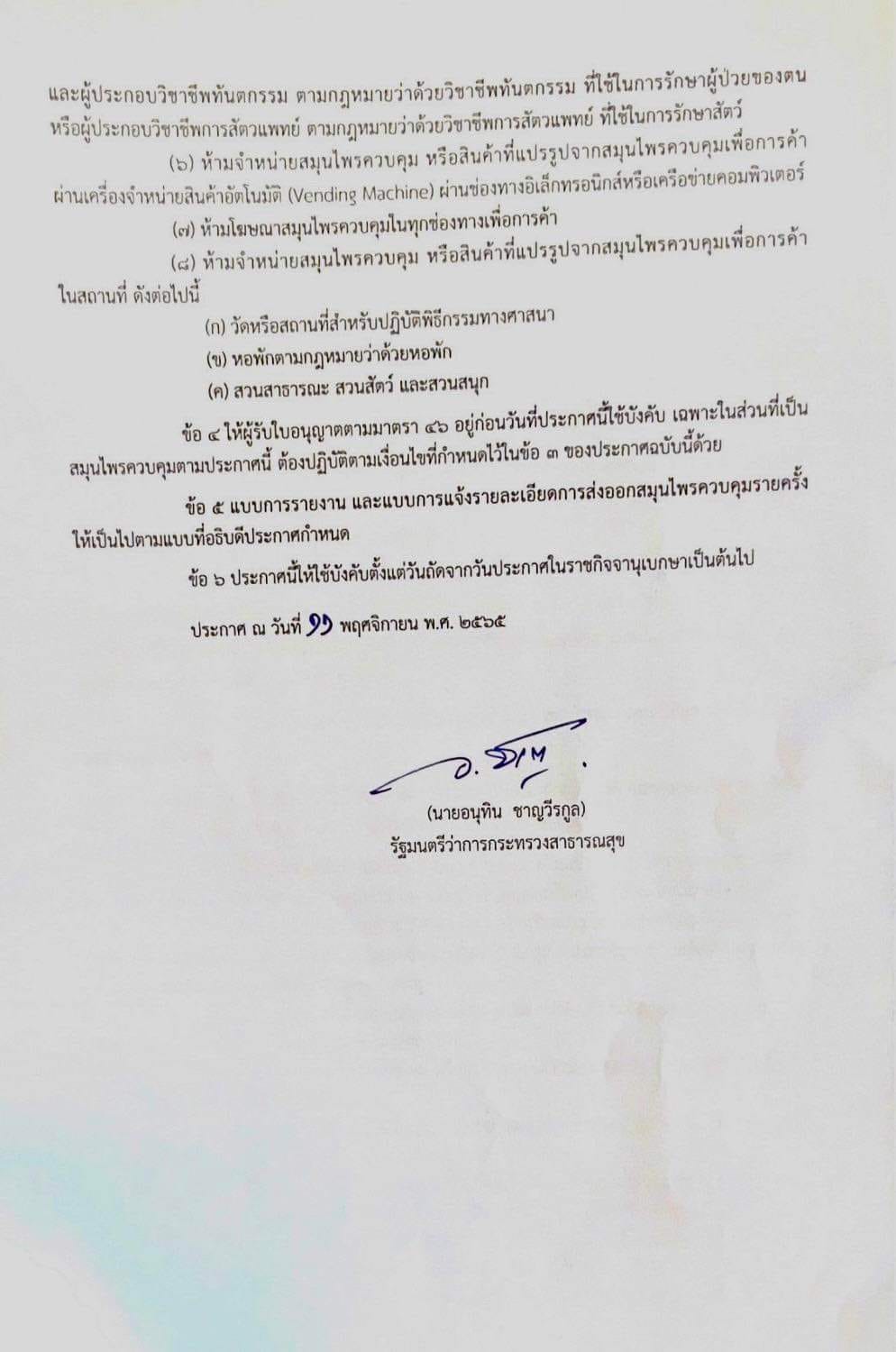 12 พฤศจิกายน 2565 ผู้สื่อข่าวรายงานว่า วานนี้ (11 พฤศจิกายน) ที่เฟซบุ๊กของ พลอากาศโท นพ. อิทธพร คณะเจริญ เลขาธิการแพทยสภา ได้ปรากฏรูปภาพเอกสารประกาศกระทรวงสาธารณสุข เรื่อง สมุนไพรควบคุม (กัญชา) พ.ศ. 2565 ฉบับล่าสุด ซึ่งนายอนุทินได้ลงนามวานนี้ พร้อมแนบข้อความว่า