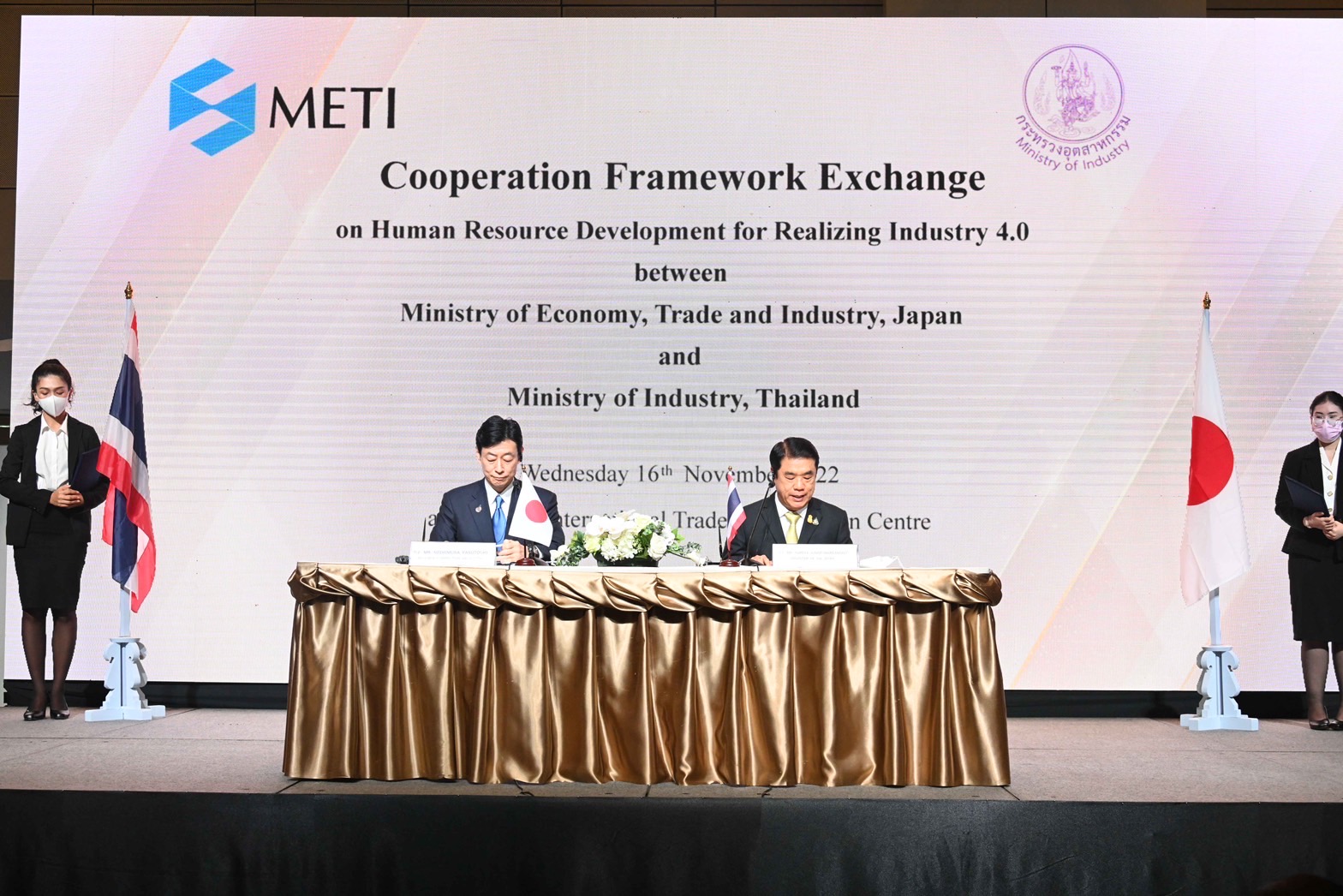 16 พฤศจิกายน 2565 เวลา 10.30 น. นายสุริยะ จึงรุ่งเรืองกิจ รัฐมนตรีว่าการกระทรวงอุตสาหกรรม ประชุมหารือความร่วมมือด้านอุตสาหกรรม และพิธีแลกเปลี่ยนกรอบความร่วมมือ “Cooperation Framework on Human Resource Development for Realizing Industry 4.0” กับ นายนิชิมุระ ยาสีโทชิ รัฐมนตรีว่าการกระทรวงเศรษฐกิจ การค้า และอุตสาหกรรม (Ministry of Economy, Trade and Industry, METI) ประเทศญี่ปุ่น