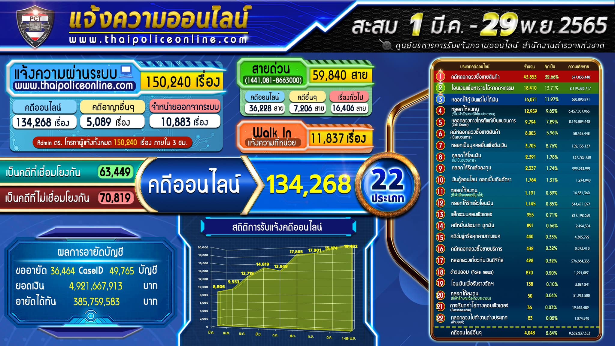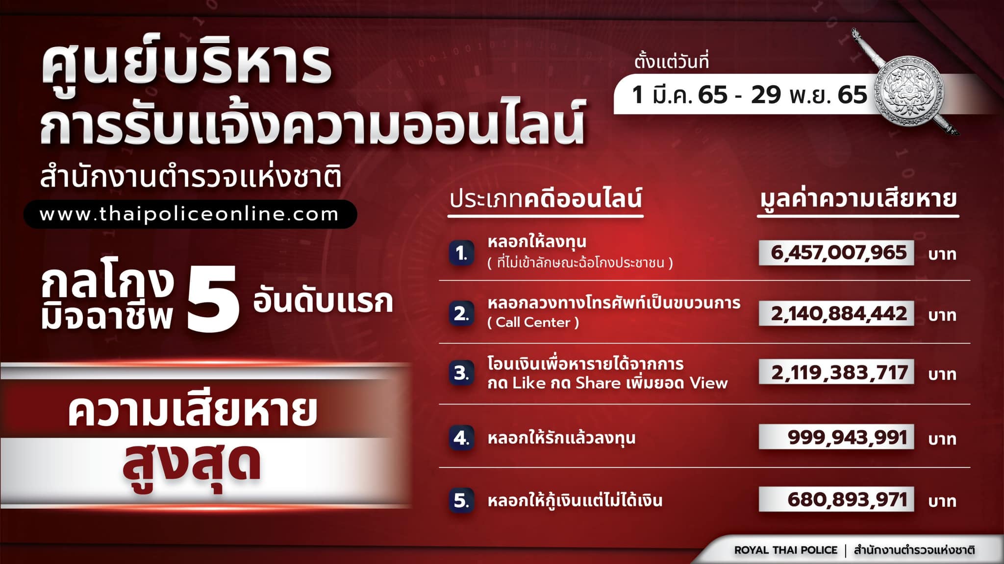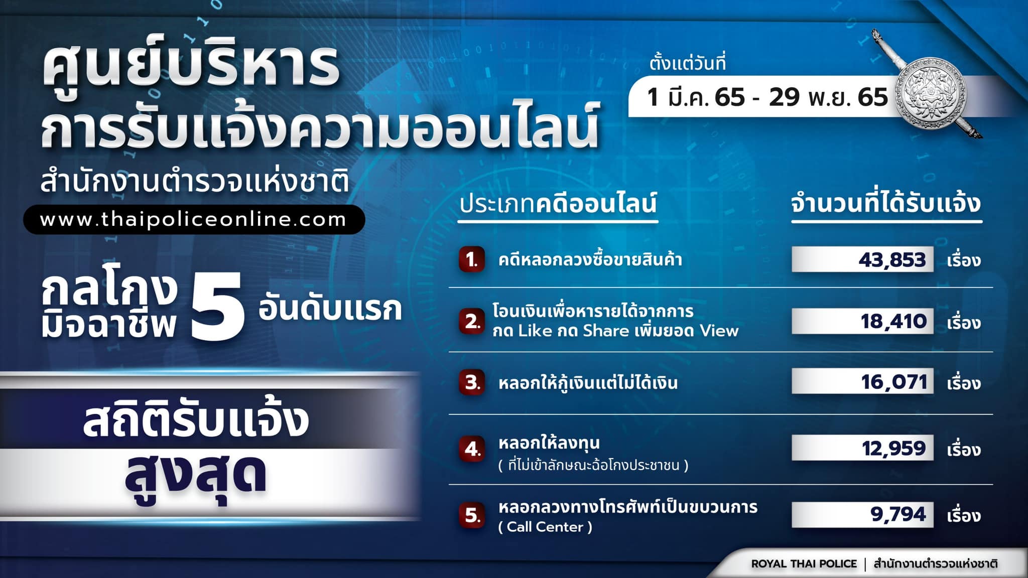 สถิติการรับแจ้งความออนไลน์ตั้งแต่ 1 มี.ค. – 29 พ.ย.65 รับแจ้งความ 134,268 คดี พบว่า ข้อมูล 5 กลโกงที่พบการรับแจ้งมากที่สุด ( 1.คดีหลอกลวงซื้อขายสินค้า 2.โอนเงินเพื่อหารายได้จากกิจกรรม 3.หลอกให้กู้เงินแต่ไม่ได้เงิน 4. หลอกให้ลงทุน 5.หลอกลวงทางโทรศัพท์แบบเป็นขบวนการ/Call Center)