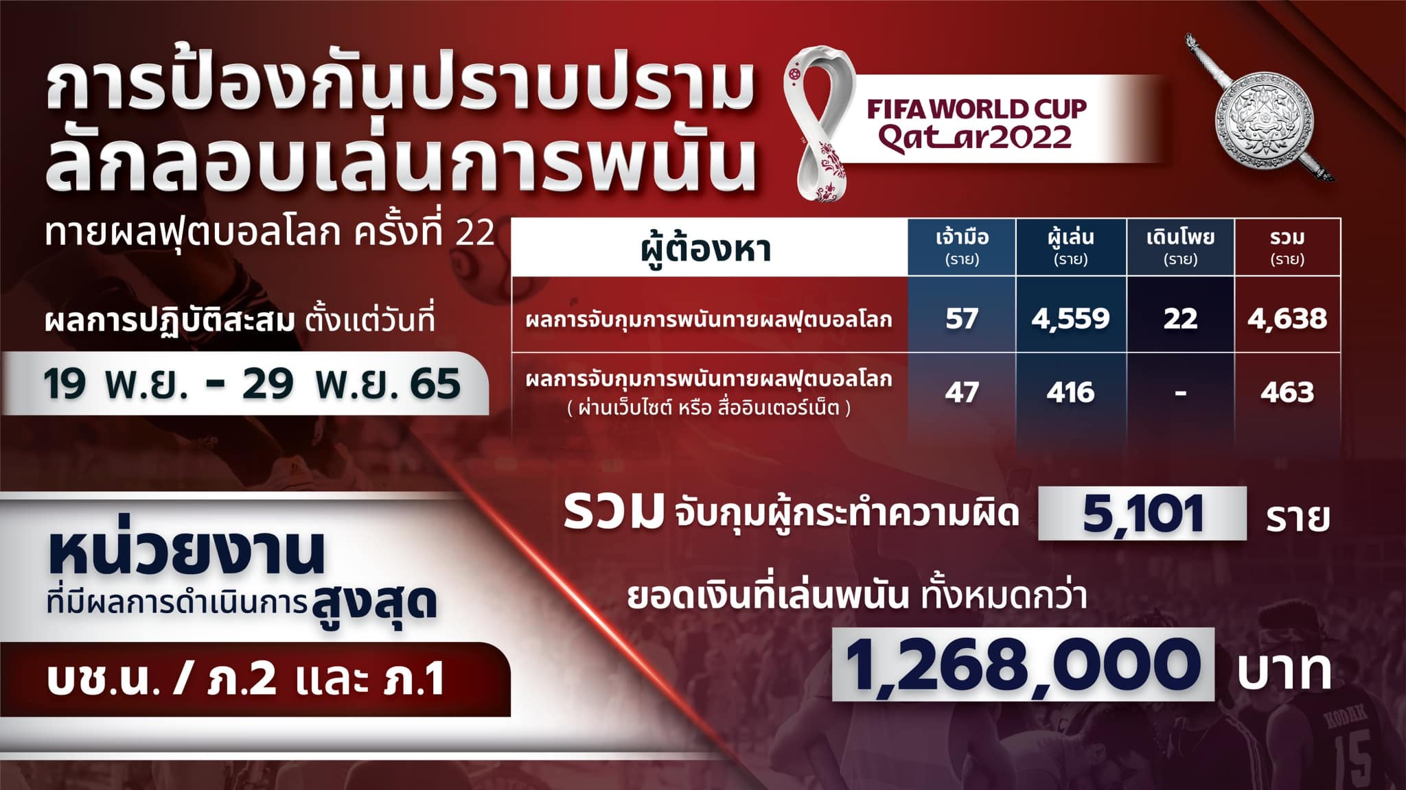 โดยศูนย์ป้องกันและปราบปรามการลักลอบเล่นการพนันทายผลฟุตบอลโลก (World Cup 2022) มีผลปฏิบัติ จับกุมเจ้ามือ จำนวน 104 ราย (เจ้ามือ 57 ราย เจ้ามือออนไลน์ 47 ราย) ผู้เล่น 4,975 ราย (ผู้เล่นทั่วไป 4,559 ราย ผู้เล่นออนไลน์ 416 ราย) เดินโพย 22 ราย รวม จำนวนทั้งสิ้น 5,101 ราย โดยยึดของกลางโพยบอล 7,064 ใบ เงินสด 98,140 บาท รวมมูลค่า 1,268,000 บาท